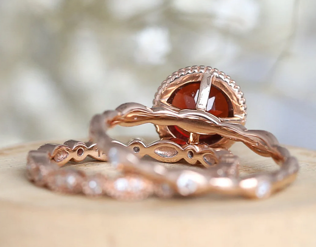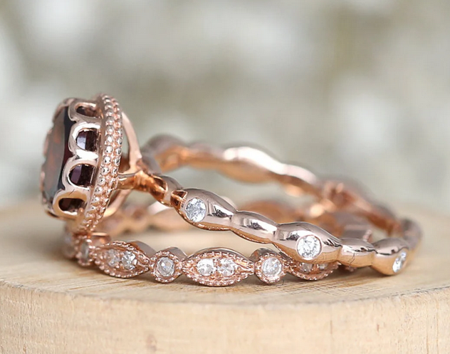 1 CT Round Cut Dark Red Garnet Rose Gold Over On 925 Sterling Silver Engagement Ring Set